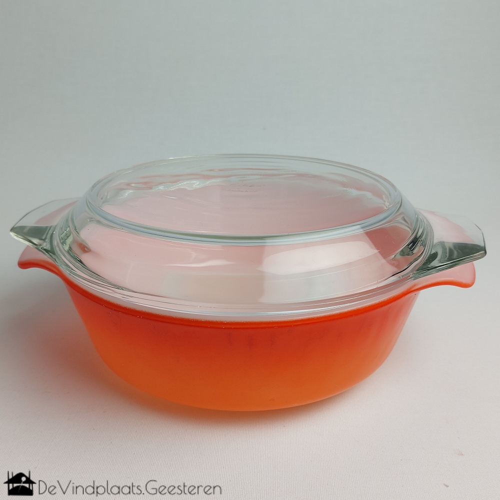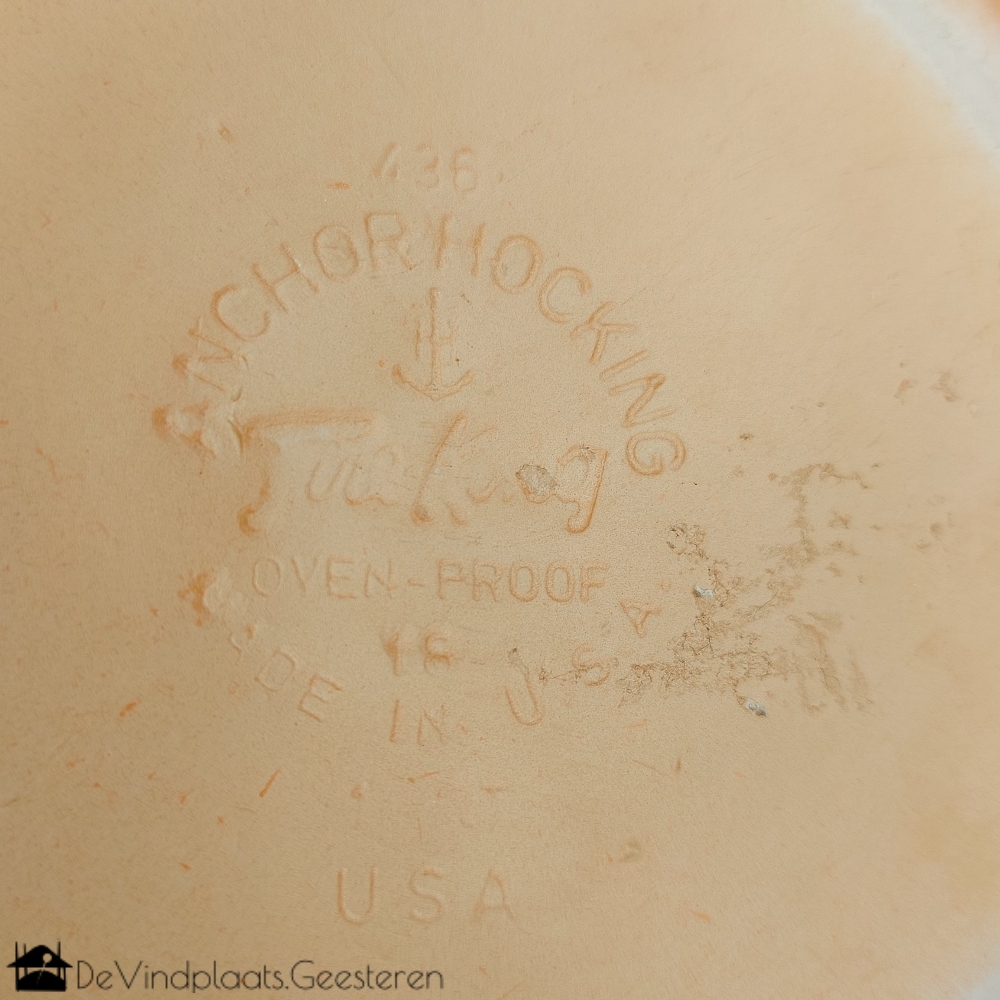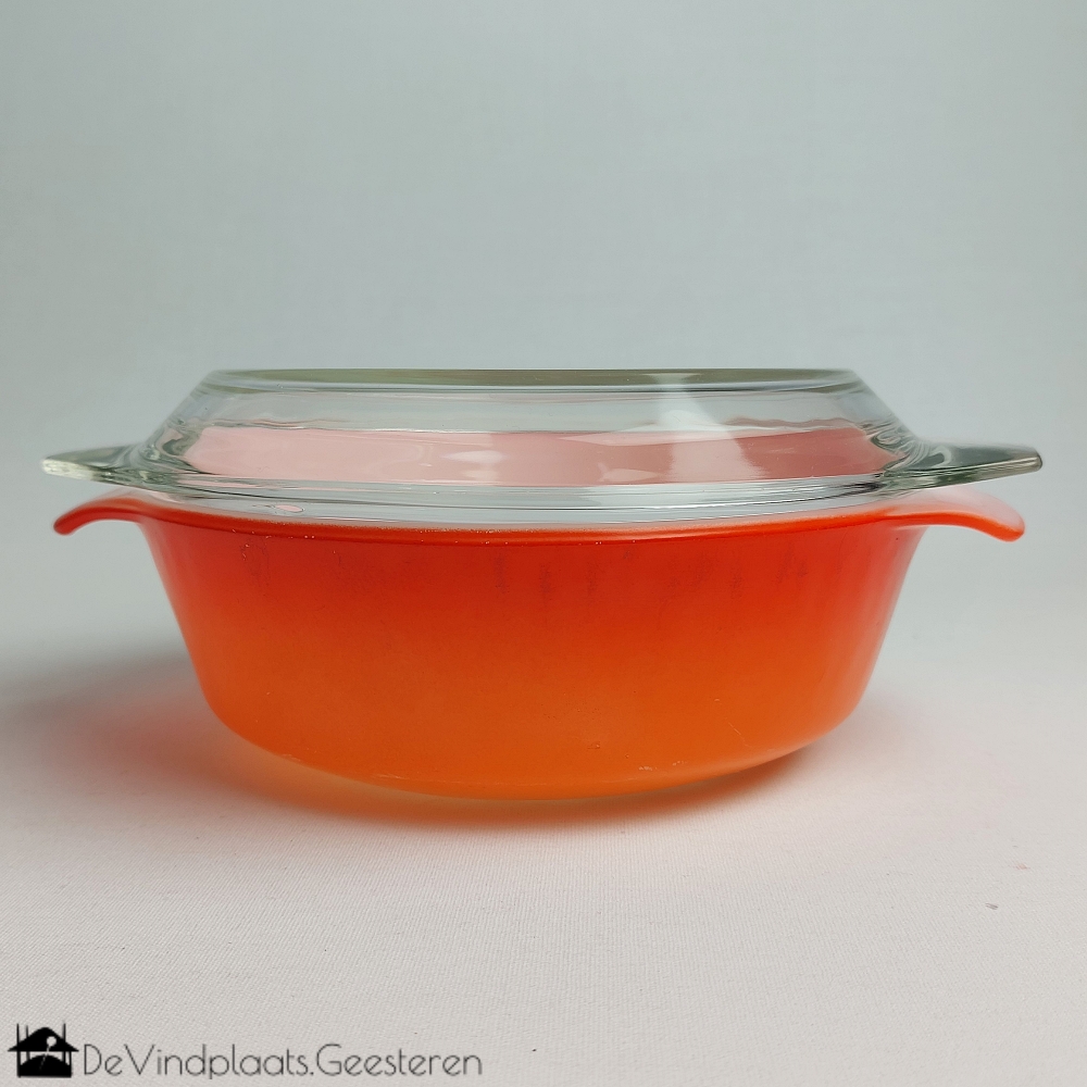 Fraaie middelgrote opaline of melkglazen ovenschaal van het merk Anchorhocking uit Amerika. Op de onderzijde gemerkt. Met een bijpassende transparante deksel van PYREX uit Engeland, ook gemerkt.